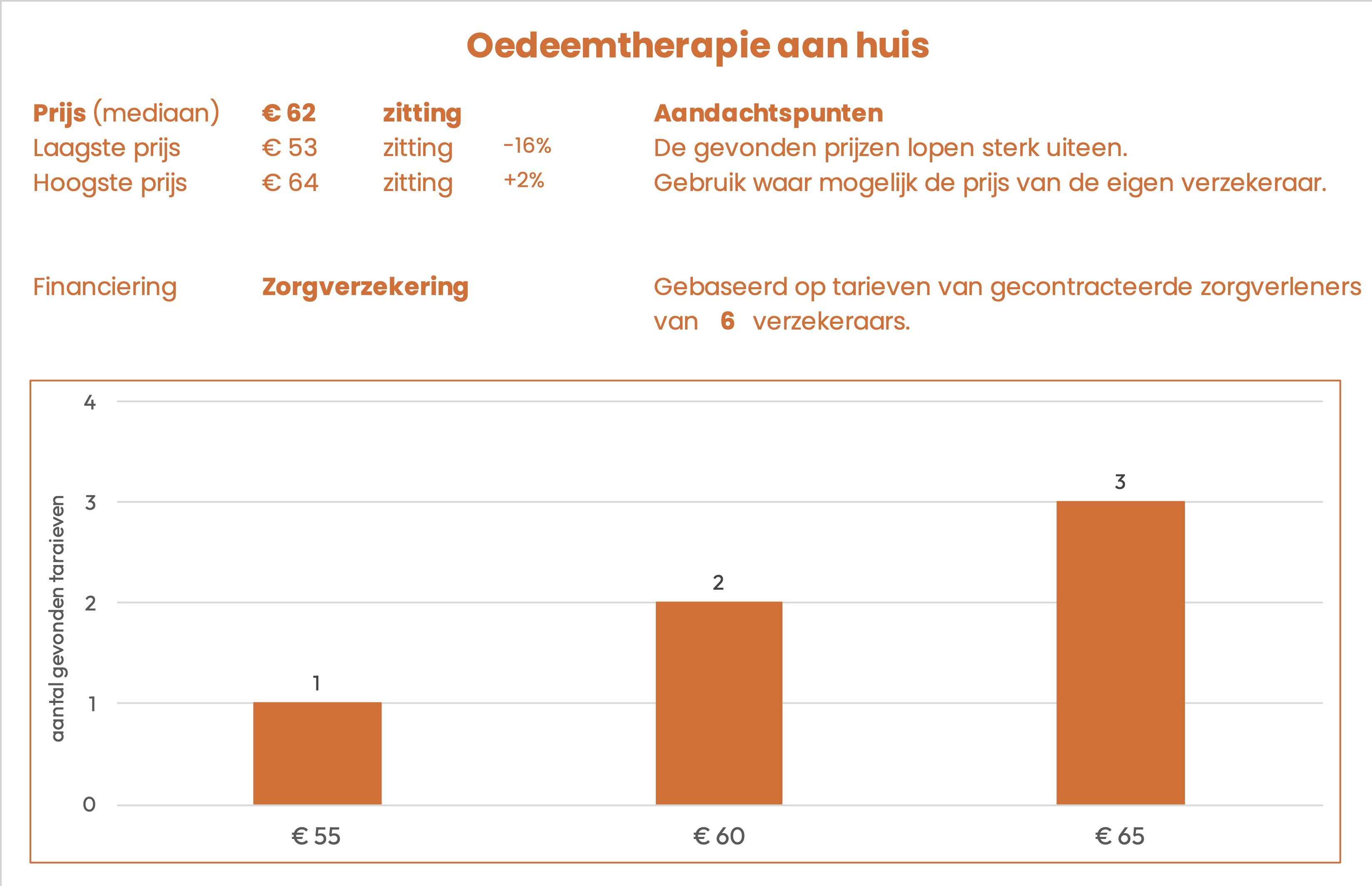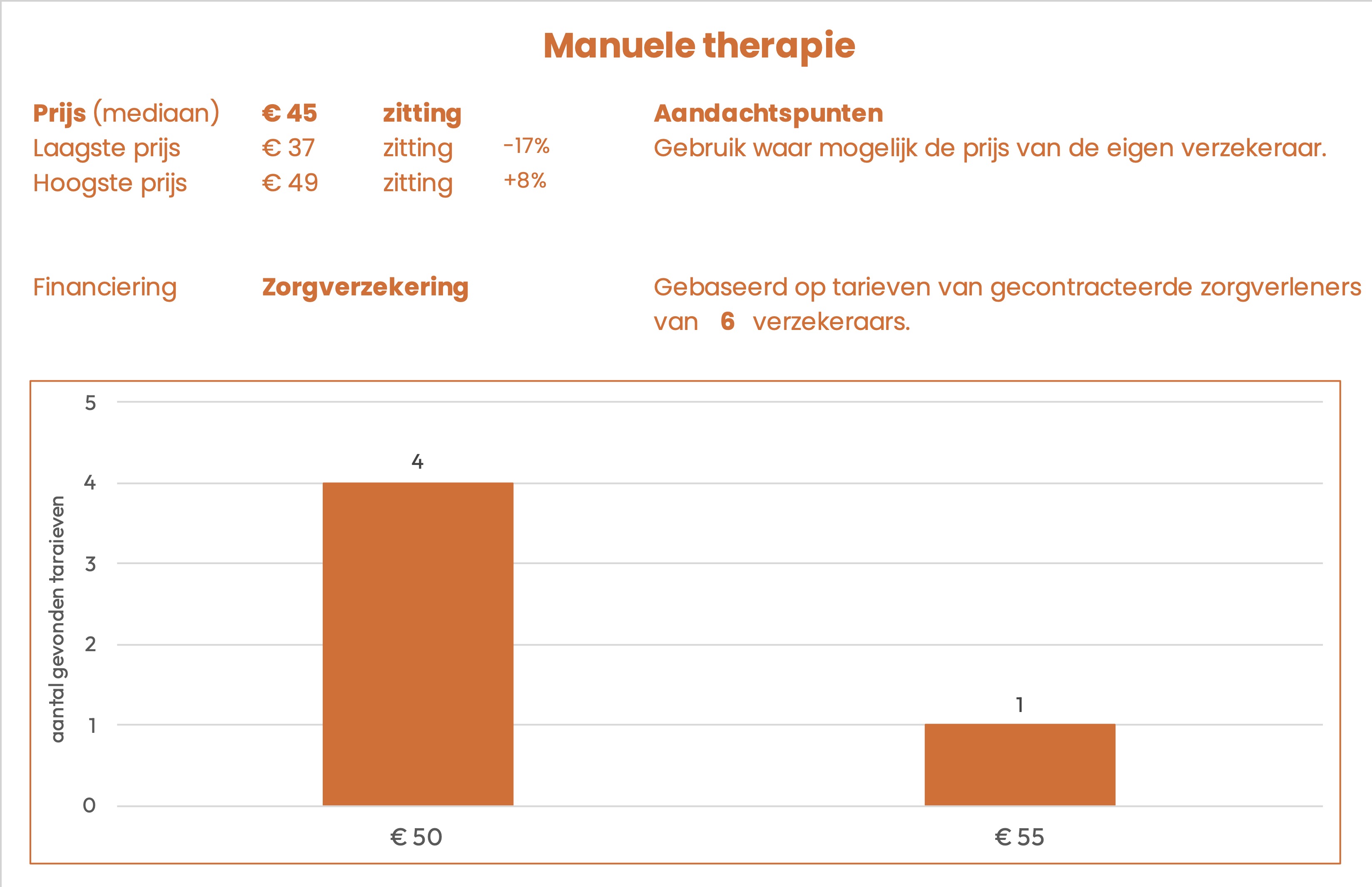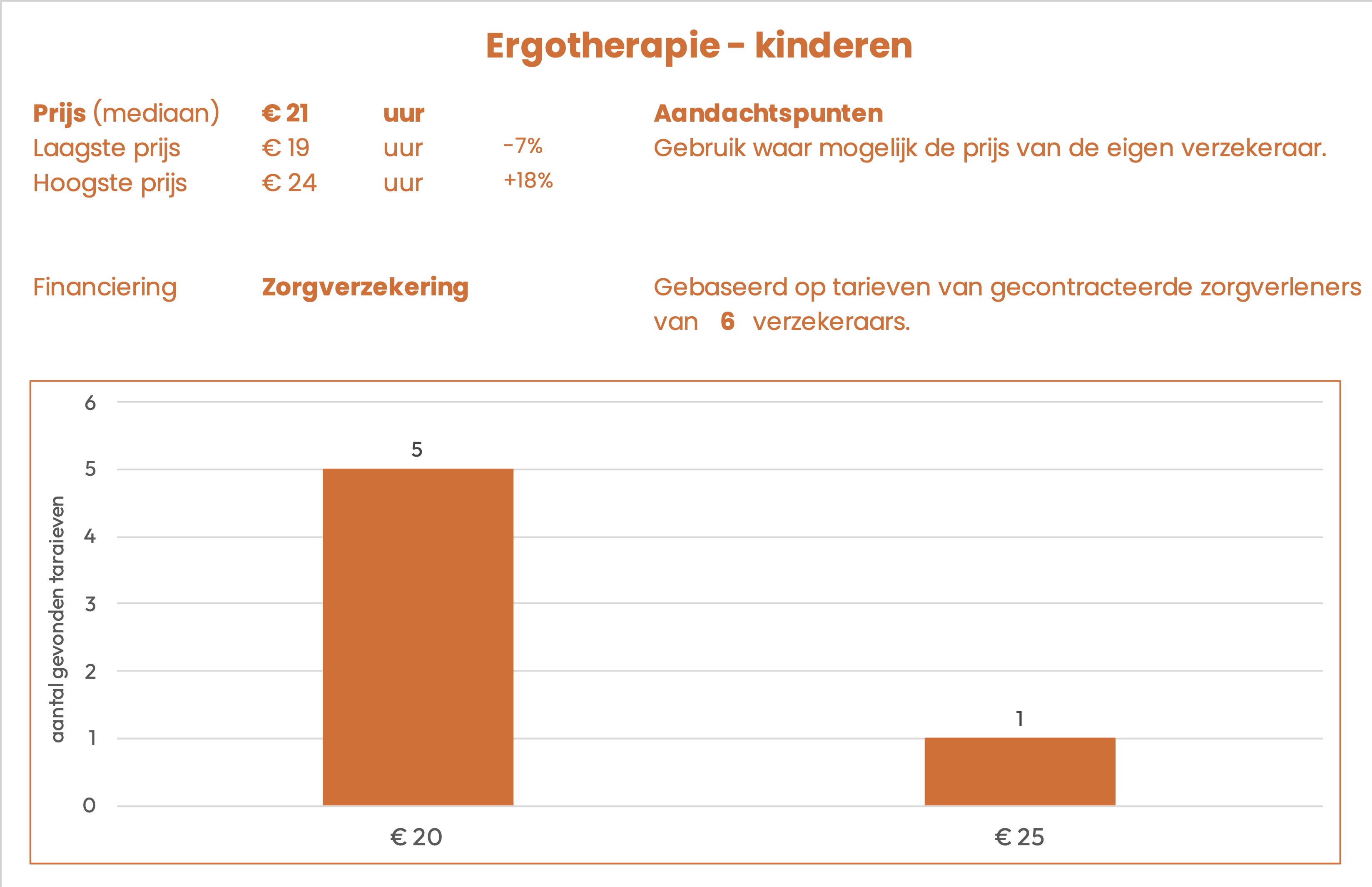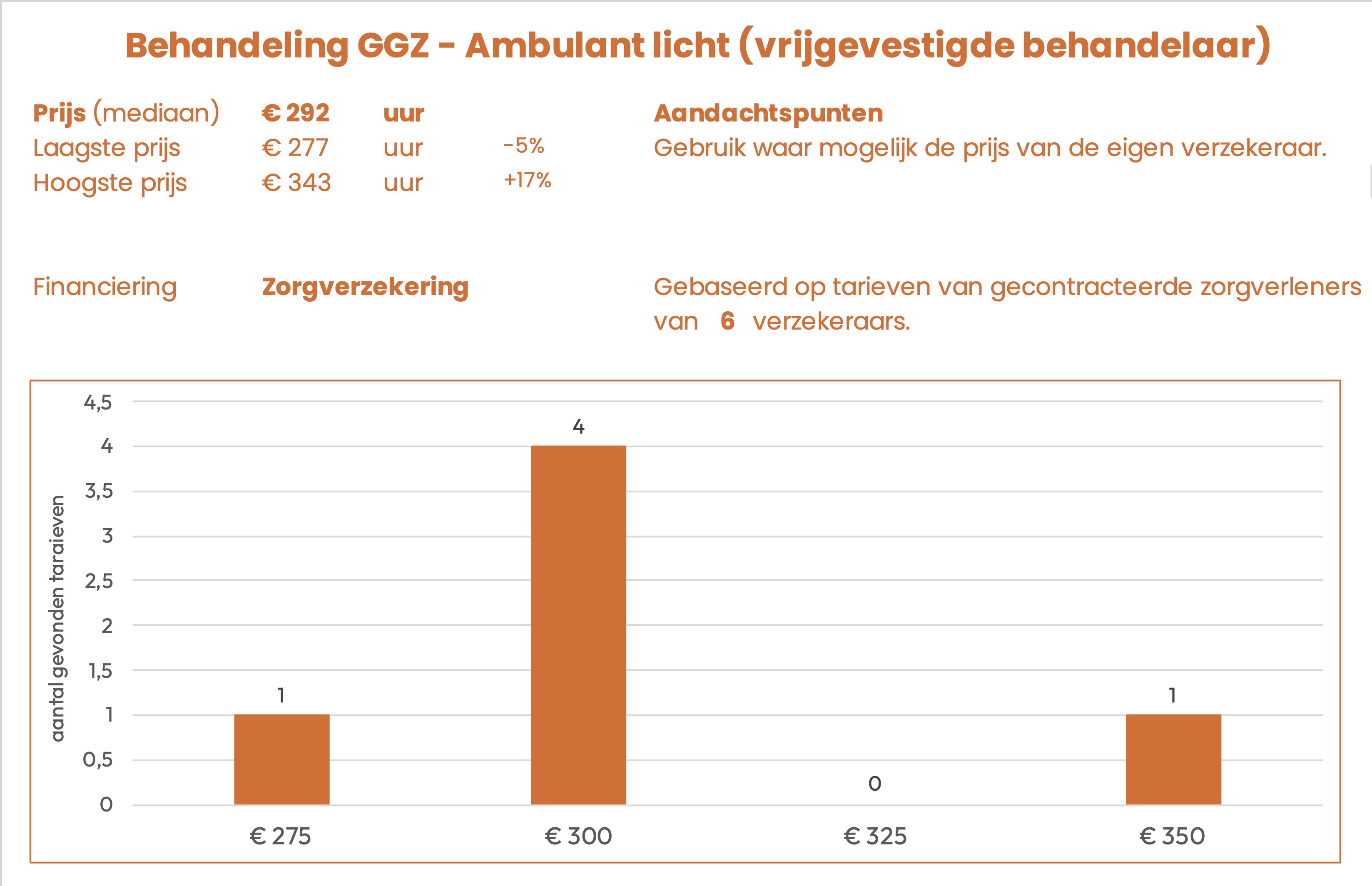 De prijzen zijn afkomstig uit openbare tarievenlijsten van 6 zorgverzekeraars. Het betreft het tarief dat gecontracteerde aanbieders in rekening kunnen brengen.